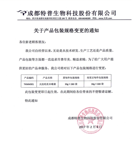 本著精益求精的工匠精神,以提高客戶滿意度為宗旨,同時根據(jù)市場需求、客戶反饋以及公司的發(fā)展需求,2月8日,公司給市場上各位新老客戶發(fā)出了關(guān)于太抗?哈茨木霉菌包裝變更的通知,公司生產(chǎn)部的同事們也正加班加點生產(chǎn),希望趕在春播前把產(chǎn)品配送到各位客戶朋友手上!
