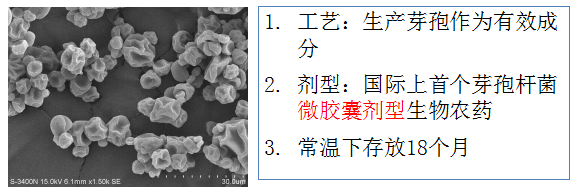 微生物包裹在微膠囊內(nèi),抗逆性強,貨架期長,效果穩(wěn)定;克服了生物農(nóng)藥常溫下不能長期存放的技術(shù)瓶頸。